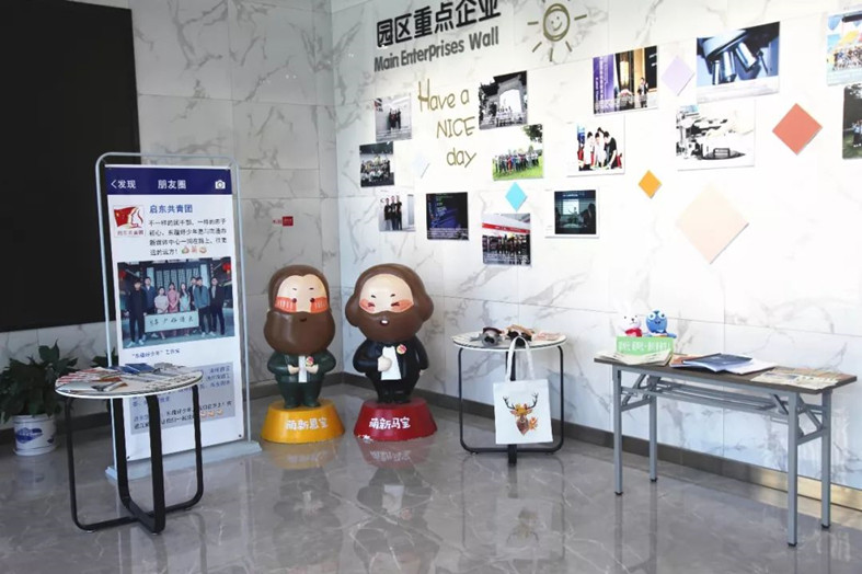 本场成果展是自南通新媒体中心落户园区以来,南通青创企业管理咨询有限公司举办的首场文创作品展。展览的作品主要是基于马列主义思想及核心价值观而制作的周边产品,如卡通玩偶、抱枕及微信包情包等。这些产品深受园区企业及其员工的喜爱。展览过程中,大家纷纷驻足欣赏,对卡通形象的马克思、恩格斯更是爱不释手。