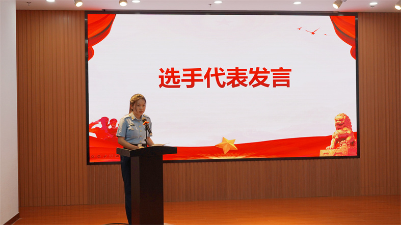 随后,我们唯一一位退役女兵代表所有参赛选手作了表态发言,向大家宣誓,将以满腔的热情、坚定的信念,全身心投入到省赛中去。