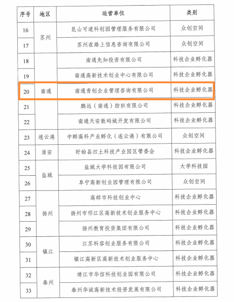 1月18日,江苏省高新技术创业服务中心正式发布国家重点研发计划“区域科技咨询服务应用示范点”首批站点名单。星中国际青创园(运营主体:南通青创企业管理咨询有限公司)获批首批示范站点。