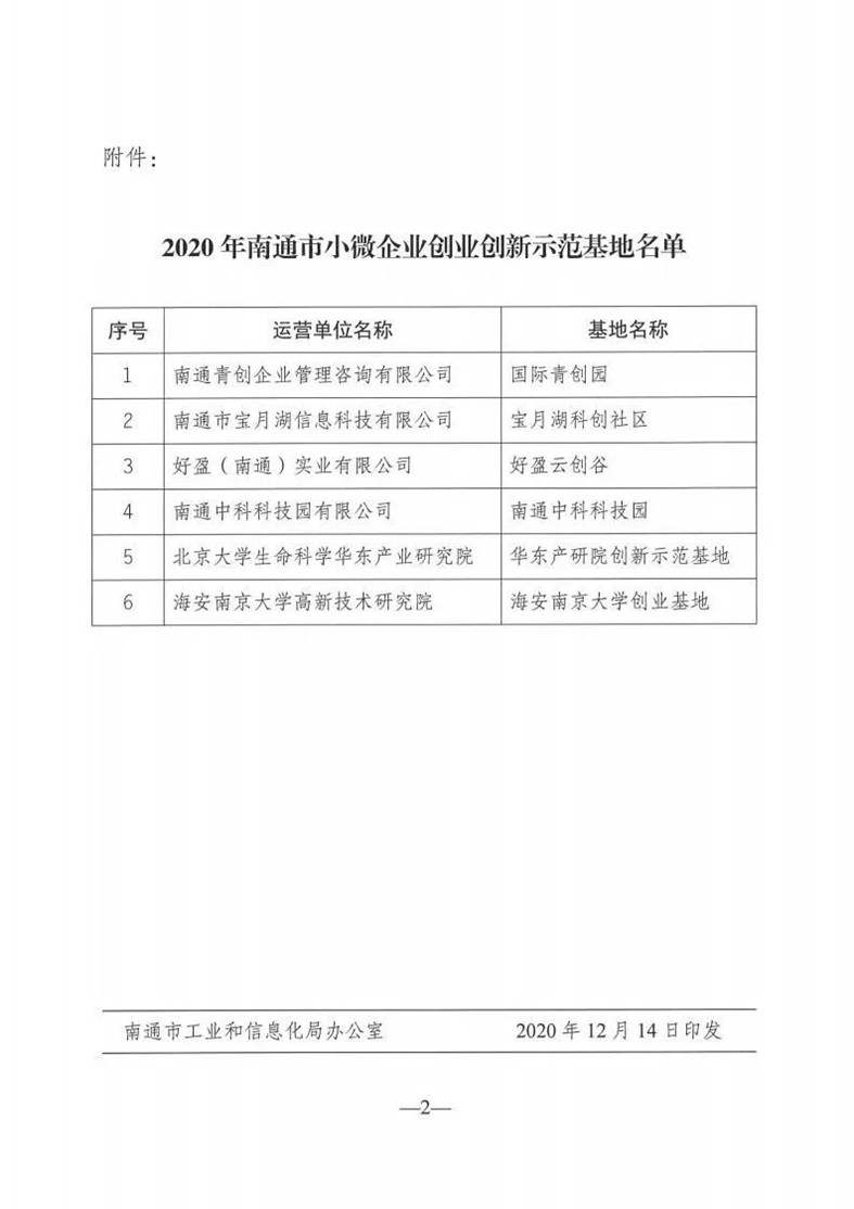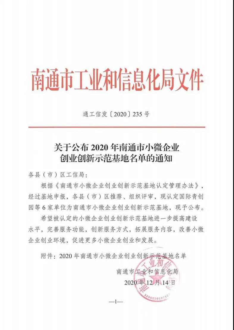 国际青创园荣获2020年南通市小微企业创业创新示范基地 | |