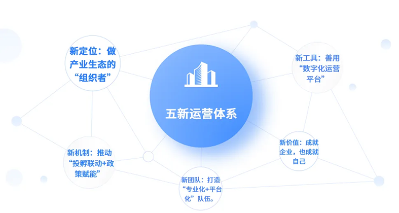 如果说前两步是搭建园区的"骨架",那么这一步就是为其注入"血肉与灵魂"。服务生态的构建,直接决定了园区能否真正助力企业实现从"生存"到"发展"的质变: 基础服务筑牢根基:涵盖物业、会议及信息系统等日常运营刚需,让企业专注核心业务,无后顾之忧。 增值服务赋能成长:围绕技术、管理、资本、创业、市场五大维度提供深度支持,构建全生命周期的成长陪跑体系。 凝心聚力 专业团队,支撑园区长远发展 园区的核心竞争力,最终依靠专业的运营团队来落地。一支优秀的园区运营队伍,须具备三大核心能力: 聚焦产业研究能力,精准把握行业趋势,为园区产业规划与企业成长提供专业指引;聚焦资源整合能力,打通政府、高校、科研机构、金融机构等多方资源,搭建企业发展的资源桥梁;聚焦服务创新能力,紧跟企业需求变化,持续优化服务内容与模式,打造差异化竞争优势。 “五新体系” 引领园区迈向新阶段 面对产业升级与数字化转型浪潮,科技园区的运营模式持续迭代,“五新体系”引领园区迈向新阶段。