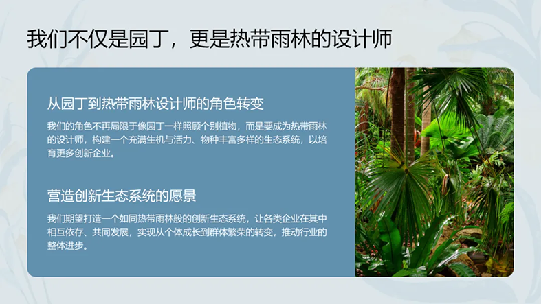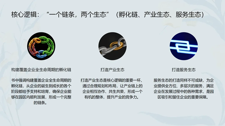 一链:从 "种子" 到 "森林" 的完整孵化链路 众创空间负责 "选种子",精准筛选有潜力的初创项目;孵化器专注 "育幼苗",将项目培育成高新技术企业;加速器助力 "快成长",推动企业实现规模化生产;产业园最终 "成森林",形成产业集群效应。