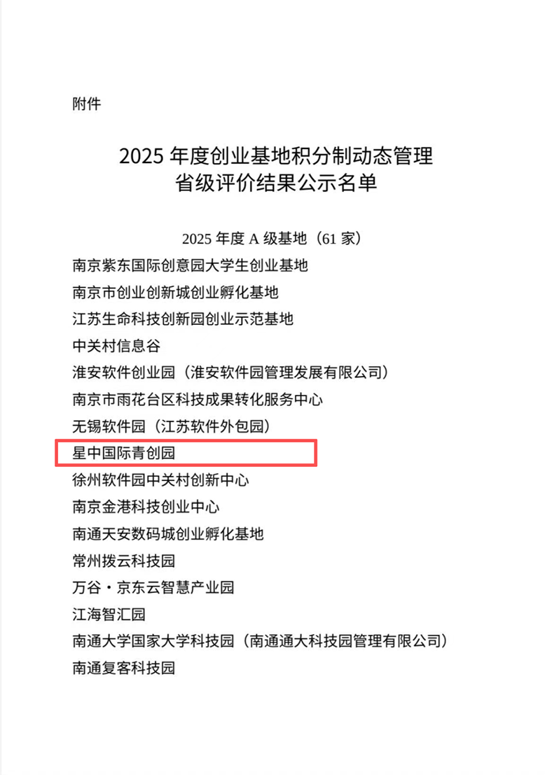 | 喜报!星中国际青创园获评2025年度省人社系统A级创业基地 | |
